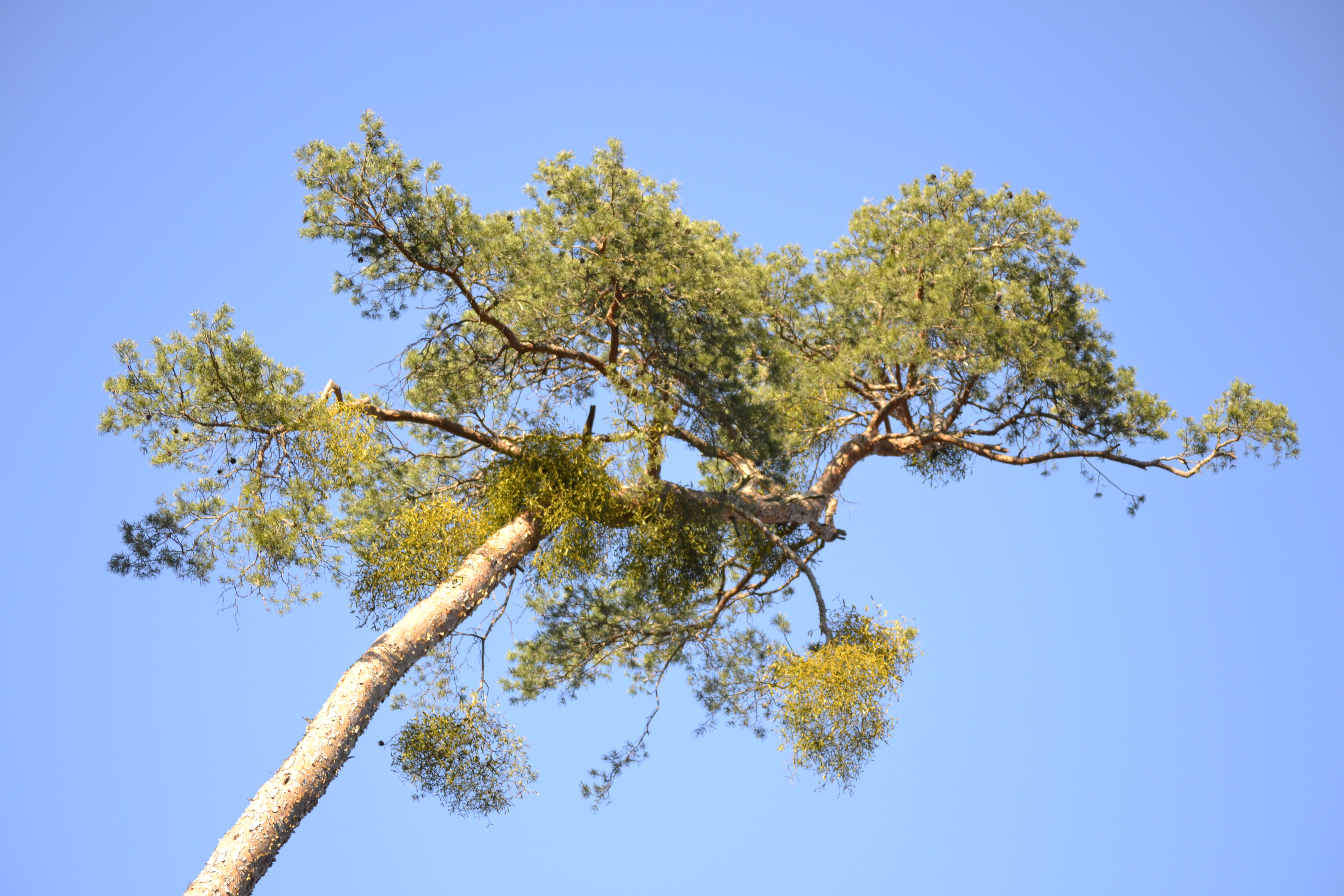 Kiefer mit Mistelbefall in der Krone: Die grünen Büsche unten links und rechts fügen sich fast nahtlos zwischen die Nadeln ein.