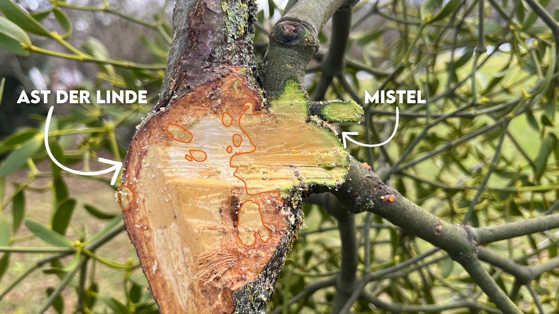 Hier haben wir in Orange grob nachgezeichnet, wie weit die Mistel in einen Ast hereinwächst. Ganz schön frech, oder?