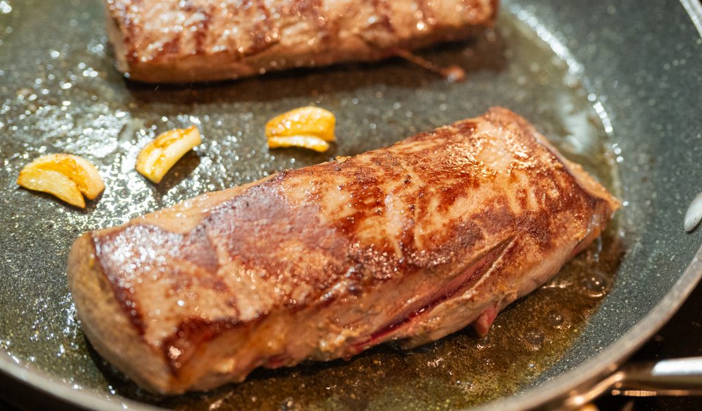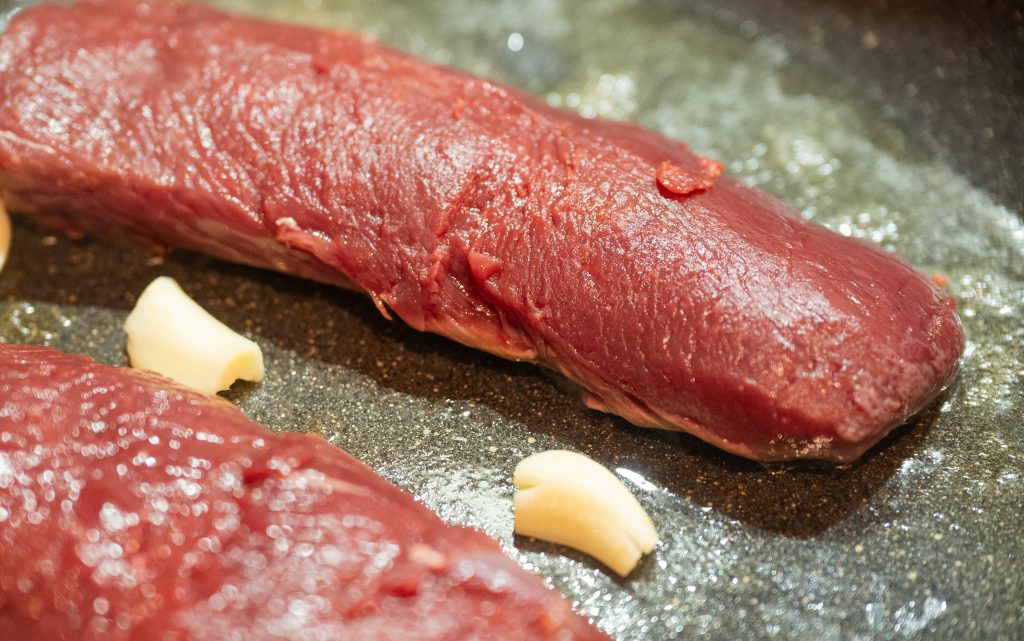 Den Rehrücken zunächst in etwas Butterschmalz in einer Pfanne mit einer Knoblauchzehe und den Kräutern von beiden Seiten scharf anbraten. Danach in eine etwas gefettete Auflaufform geben und bei ca. 150 Grad (Umluft) für ca. 20 Minuten garen. Am besten ist es, wenn Ihr ein Braten-Thermometer habt. Bei einer Kerntemperatur von 54 bis 58 Grad Celsius ist das Fleisch noch leicht rosa und dadurch sehr zart und saftig.