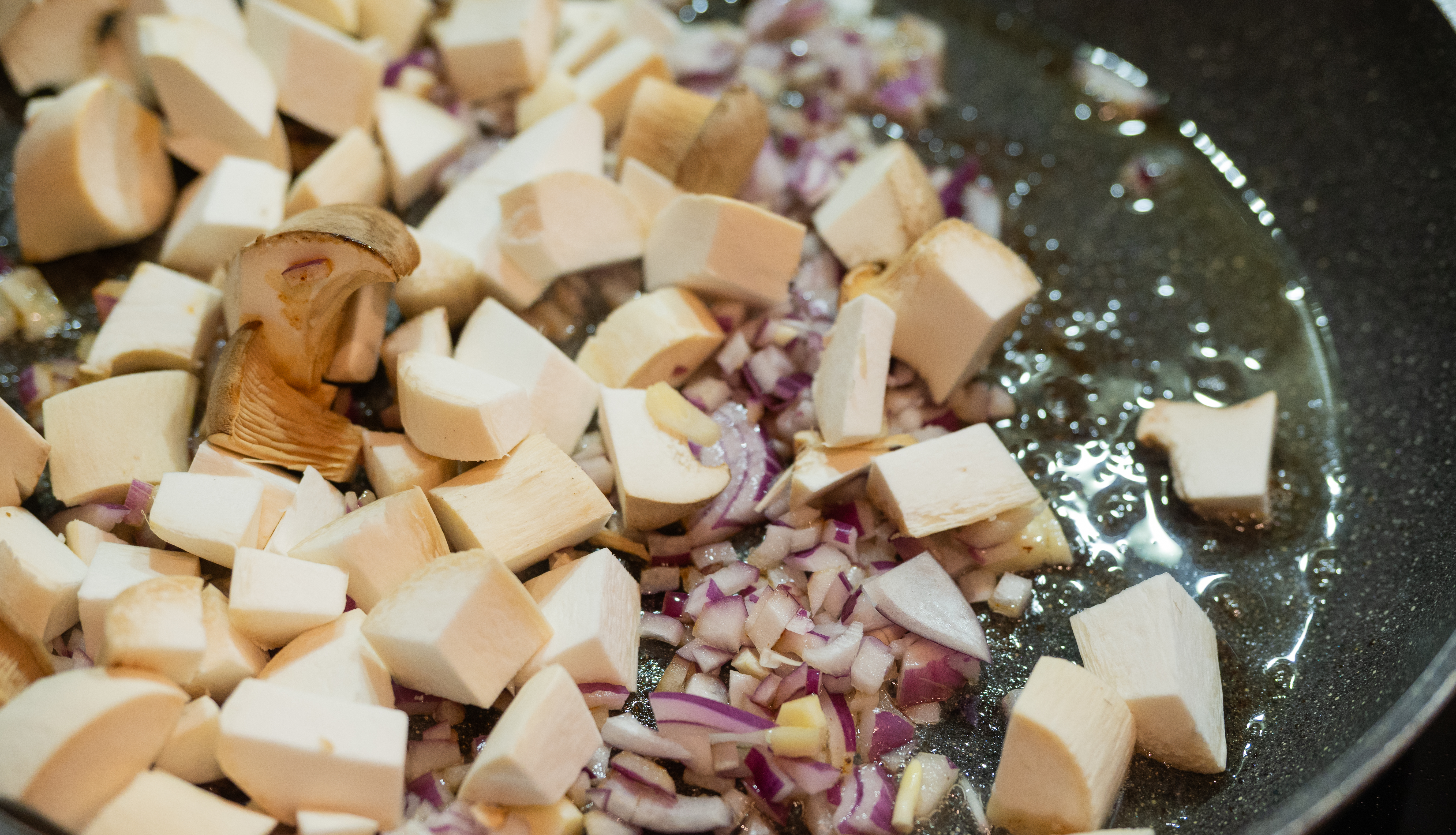 Während das Fleisch im Ofen gart, könnt Ihr nun eine Zwiebel klein würfeln und ebenso eine Zehe Knoblauch. Die Kräuterseitlinge in größere Würfel schneiden und alles gemeinsam in einer Pfanne anbraten. Zum Schluss mit etwas Sojasauce ablöschen und etwas Thymian und Rosmarin hacken und ebenfalls dazugeben. Die Pilze bei niedriger Temperatur ziehen lassen.