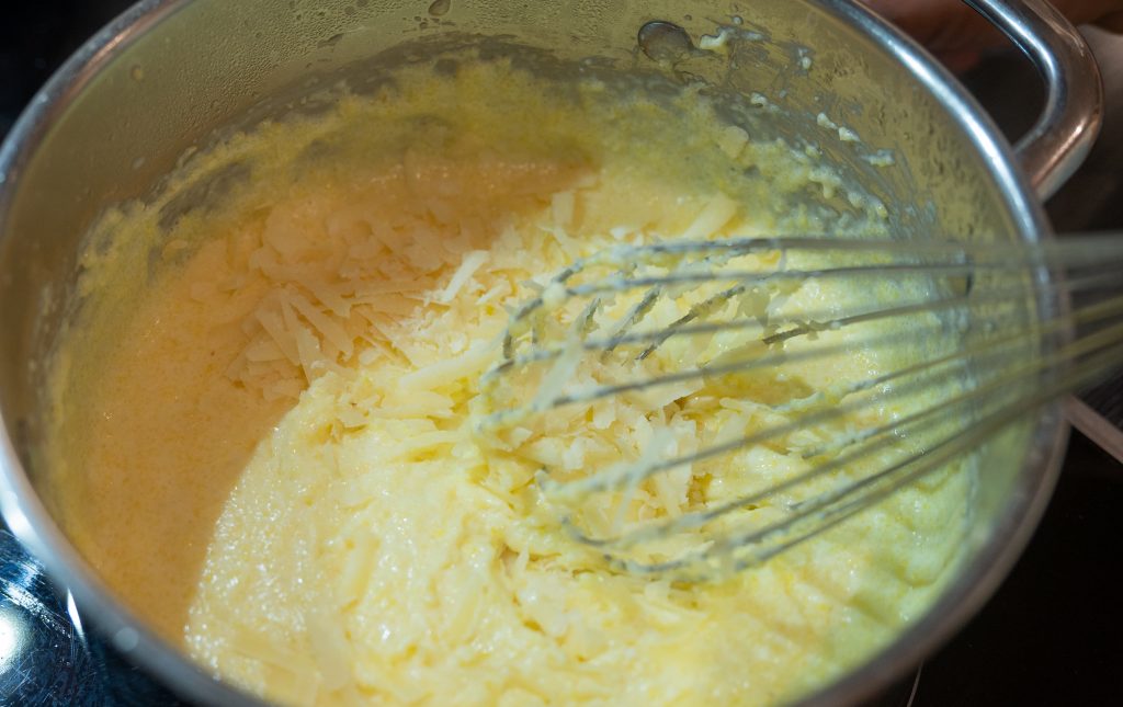 Für die cremige Polenta zunächst die Milch mit etwas Salz zum Kochen bringen. Sobald die Milch kocht, die Polenta dazugeben und mit einem Schneebesen kräftig rühren. Die Hitze reduzieren und die Polenta etwa 10-15 Minuten ziehen lassen. Je nach Cremigkeitswunsch könnt Ihr auch noch etwas Milch nachgegen. Dann kommt der Parmesan und die Butter dazu. Mit Salz und Pfeffer abschmecken.