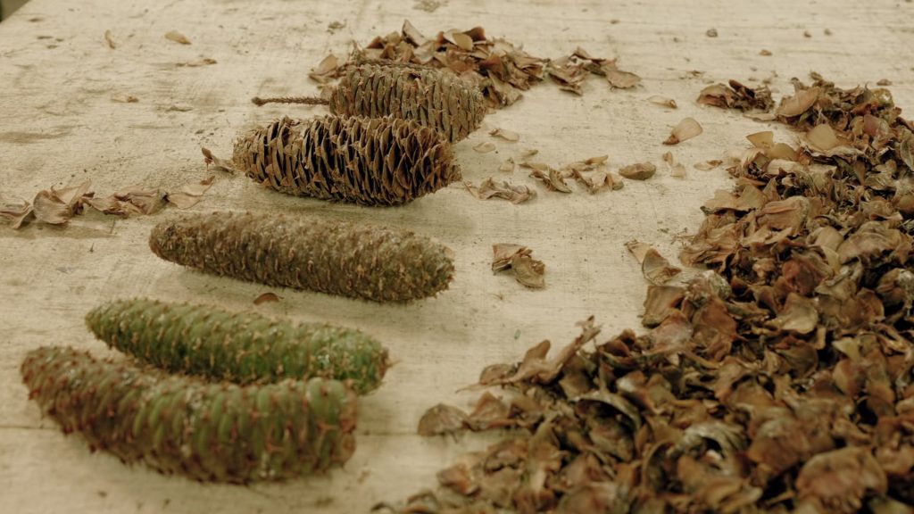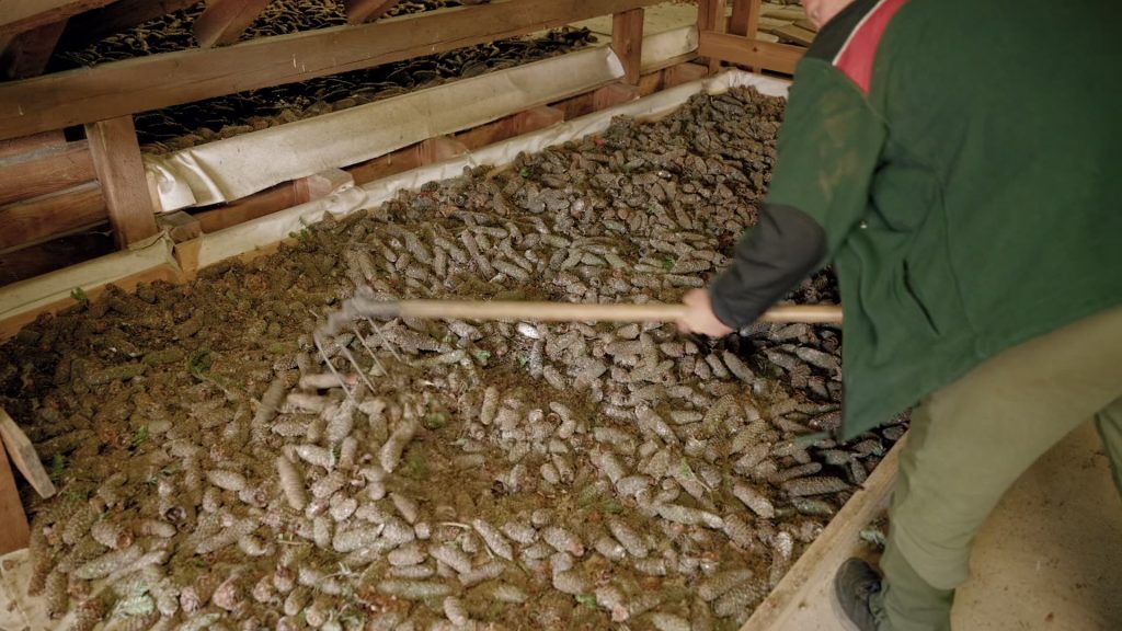 Zunächst werden die Zapfen zum Nachreifen und Trocknen gelagert. Durch regelmäßiges Umschichten verhindert man, dass sie schimmeln und entzieht weiter Feuchtigkeit.
